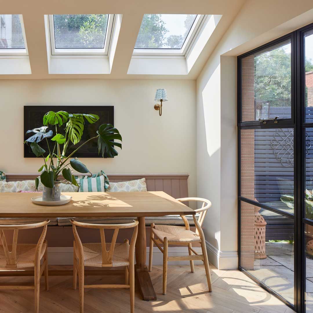 The glazed roof over the kitchen transforms into a double-pitched space, providing a warm and tranquil ambiance to the family dining and seating area while offering a picturesque view of the garden.
