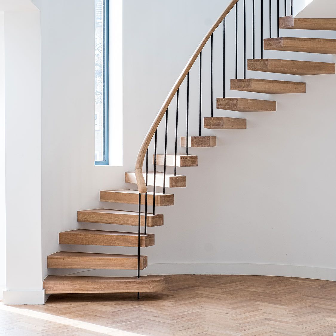 A bespoke open tread oak staircase cantilevered from a curved external wall with slim steel spindles
