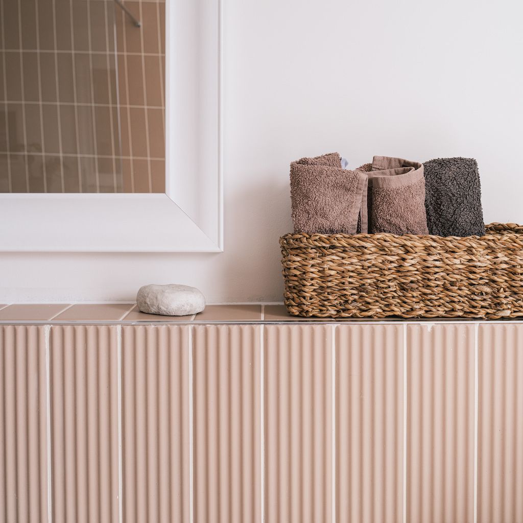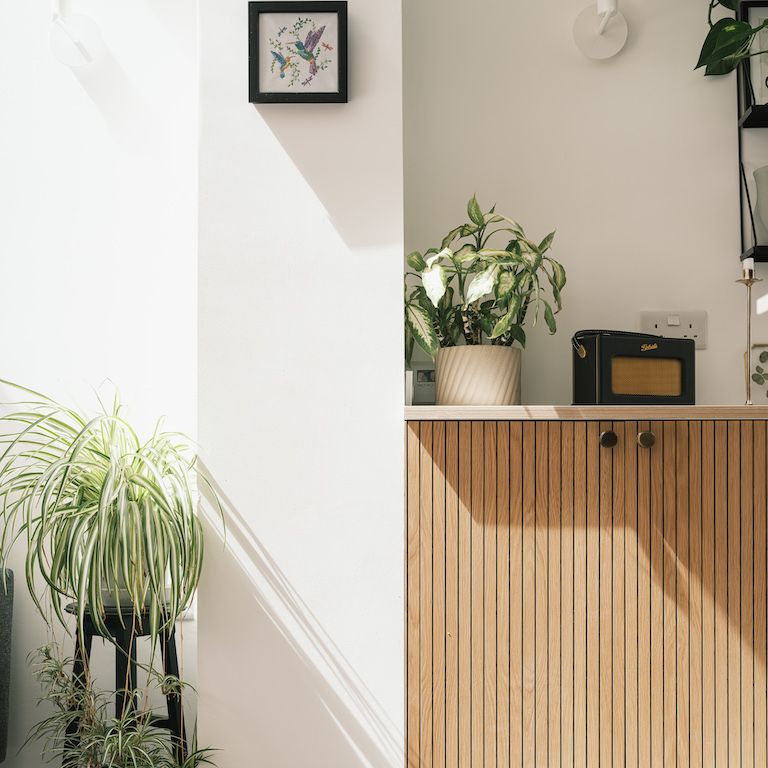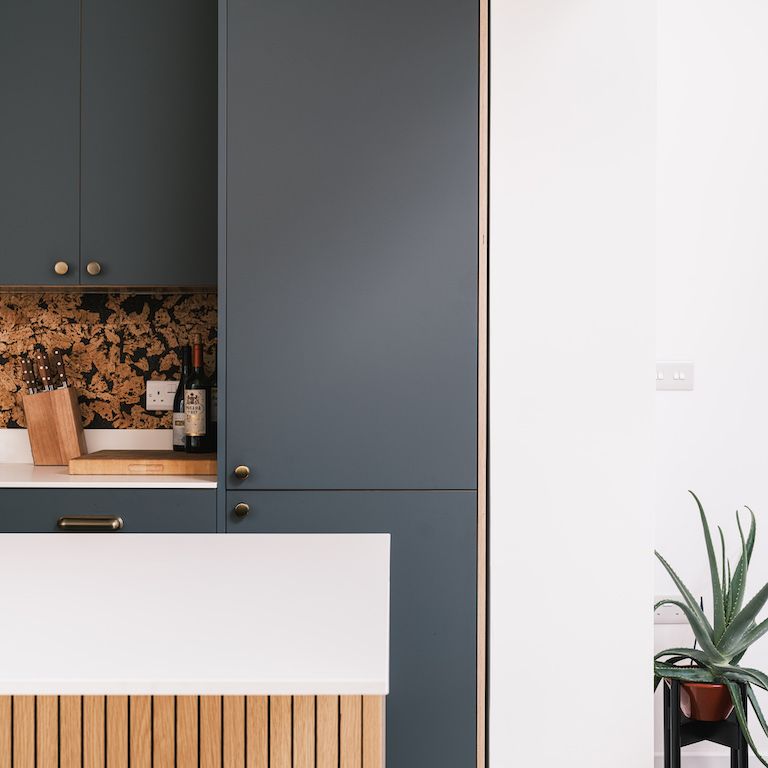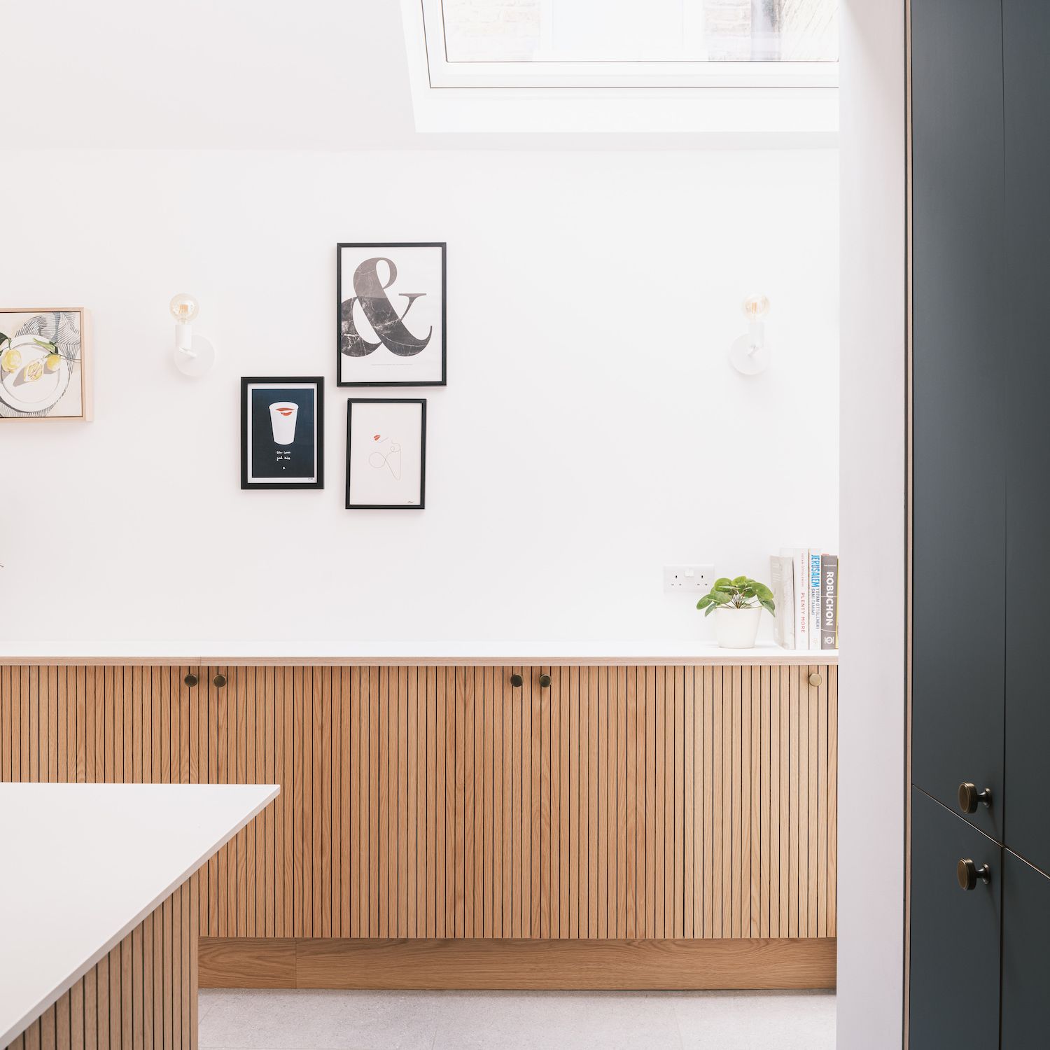 A lovely combination of the fluted wood kitchen against the bright walls and the dark grey cabinets.