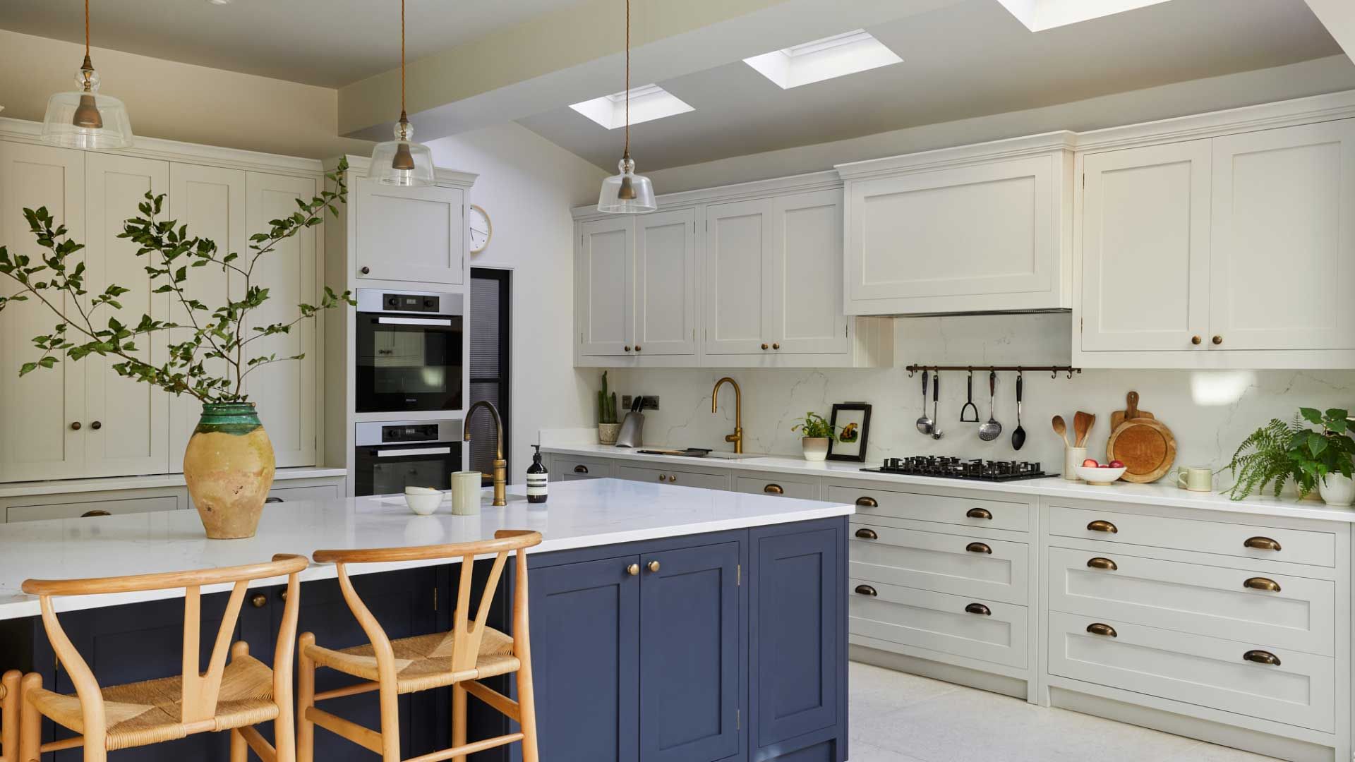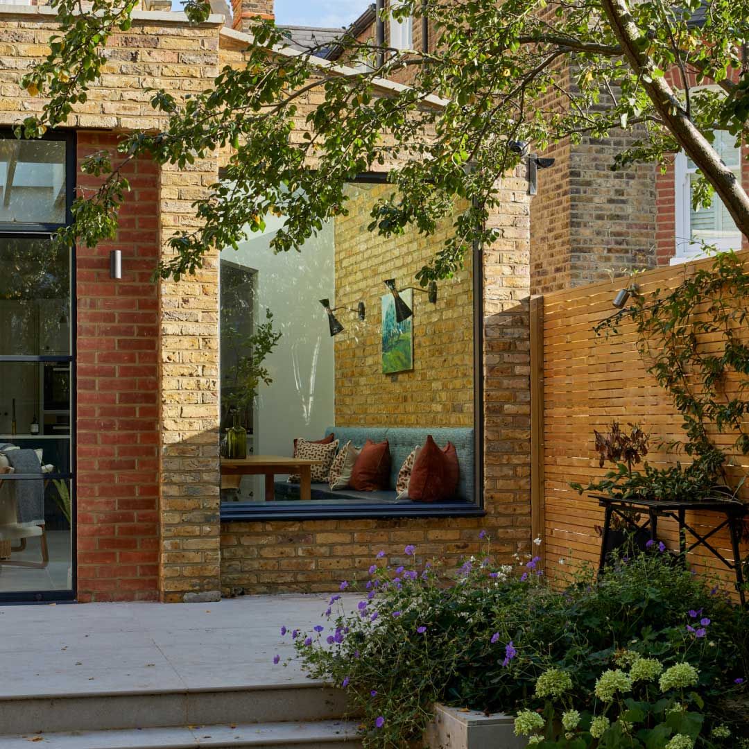 A picture window complements the bench seat nook, which function as an everyday dining area, a remote working spot, and a dedicated homework space for children.